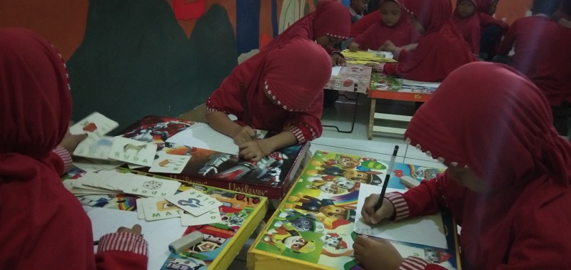 Para siswa sedang menulis objek yang ada disetiap kartu bergambar