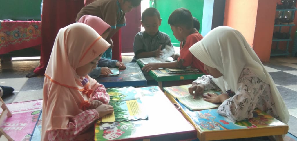 Para siswa sedang belajar membaca di halaman perpustakan KB TK ICN